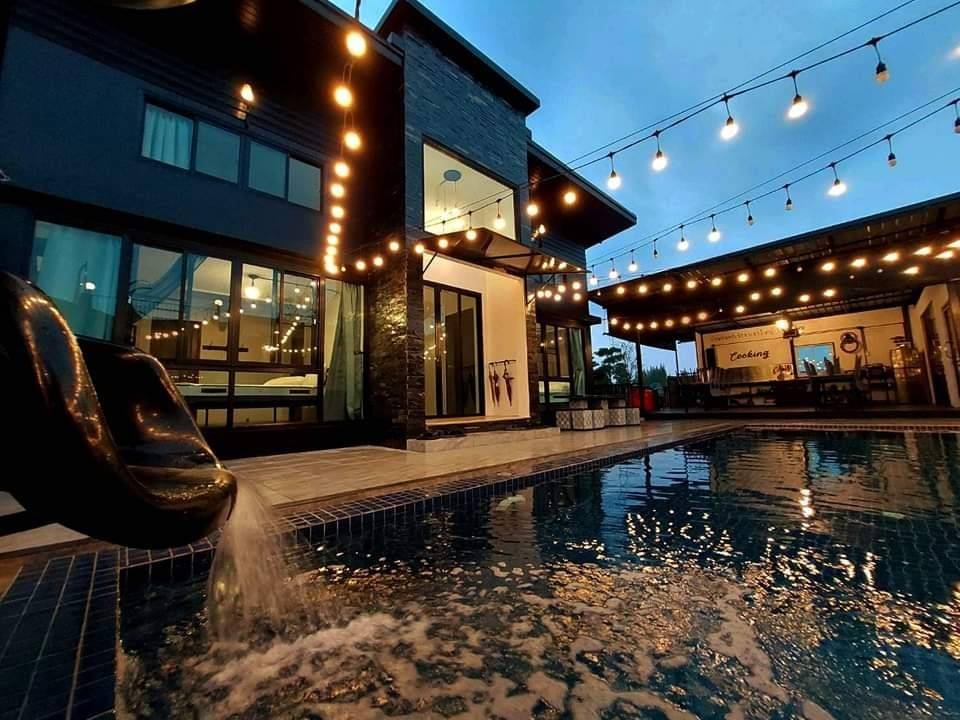 Pool villa บ้านจันทร์เจ้าขา เขาใหญ่ เป็นบ้านพักส่วนตัว แบบบ้านเป็นรูปตัวยู ส่วนตรงกลางเป็นสระว่ายน้ำ รอบข้างด้วยห้องคาราโอเกะ,ครัวนั่งทานริมสระ อีก2ฝั่งเป็นห้องนอนหันหน้าเข้าหาสระว่ายน้ำ หรือเรียกได้ว่า”บ้านล้อมน้ำ” และจะทำให้บ้านเย็นสบายมากยิ่งขึ้น